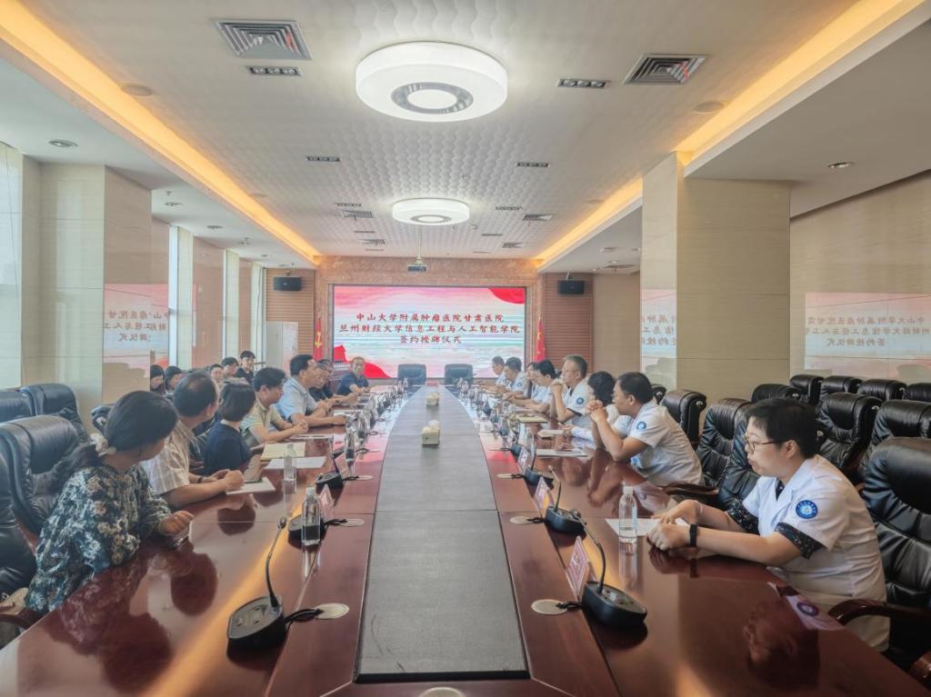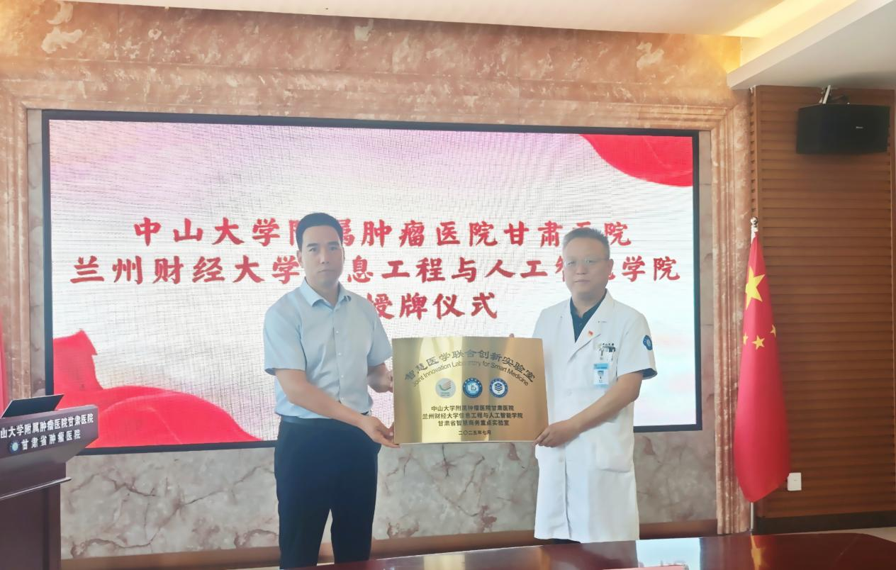 《“健康中国”2030规划纲要》战略明确提出要把保障人民健康放在优先发展的战略位置,加快医疗科技创新,推进医疗服务智慧化。7月30日上午,兰州财经大学信息工程与人工智能学院师生赴中山大学附属肿瘤医院甘肃医院参加“智慧医学联合创新实验室”签约授牌仪式,中山大学附属肿瘤医院甘肃医院党委书记张云、副院长王军、蔡清清等领导及相关科室负责人出席仪式;兰州财经大学信息工程与人工智能学院党委书记杨明鑫、副院长张克宏、甘肃省智慧商务重点实验室副主任杨佳澄等师生参加仪式。仪式由中山大学附属肿瘤医院甘肃医院科教科科长朱公建主持。