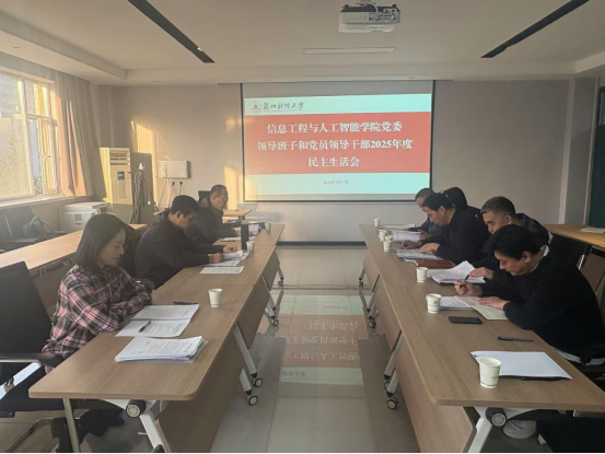 根据校党委统一部署和要求,1月17日上午,信息工程与人工智能学院召开2025年度党委领导班子和党员领导干部民主生活会。校党委常委、副校长黄恒君、党委教师工作部人事处处长曹志远、党委组织部(党校)组织科副科长张盼到会指导,学院党委书记杨明鑫主持会议。学院领导班子成员、办公室主任、组织员、党支部书记代表参加会议。